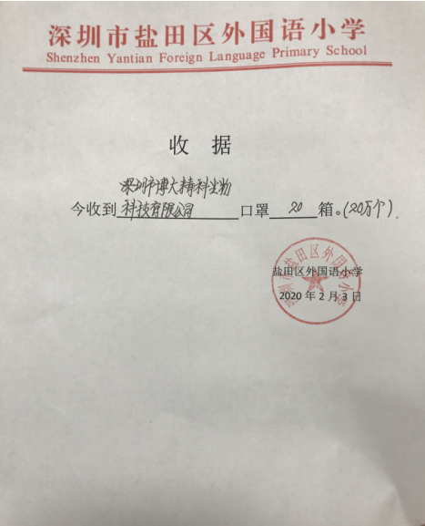 疫情無情人有情,關鍵時刻顯真情。2月3日下午,深圳市博大精科生物科技有限公司相關負責人給深圳市鹽田區(qū)教育系統(tǒng)送來了一份特殊的禮物——20萬個一次性防護口罩。